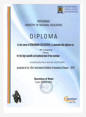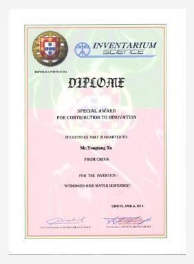 经过长期不懈的钻研,公司的氢水发生器与富氢活化水直饮机成功获得国家专利,展现出强大的技术优势。在第 42 届日内瓦国际发明展上,公司的发明项目从众多竞争者中脱颖而出,荣获食品类发明金奖,并一举斩获三项大奖。